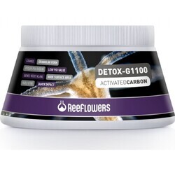 ReeFlowers Detox-G1100 Activated Carbon, yüzey alanı geniş, yüksek aktiviteye sahip, çok hızlı etki eden bir aktif karbondur.Suda çözünmüş organik ve inorganik atıkların ve toksik maddelerin akvaryum suyundan uzaklaştırılmasını ve suda oluşan sarı rengin giderilmesini sağlar. İlaç tedavisi sonrası sudaki zararlı etken maddelerin giderilmesi için kullanılır. Fosfat salınım seviyesi düşüktür (POI seviyesi sadece 1,8). Yosun oluşumuna sebep olmaz. Suyun Kristal berraklığında olmasını sağlar ve su kalitesini arttırarak canlılar için daha sağlıklı bir ortam oluşturur.KULLANIM TALİMATIMedya reaktörü içerisinde, dış filtrede veya ürün ile birlikte verilen kese içerisinde su geçişinin hızlı olduğu bir bölümde kullanılmalıdır. Kullanmadan önce durulanması tavsiye edilir.Tatlı su ve tuzlu su akvaryumlarında kullanıma uygundur. Genel kullanımda 100 lt için 90 ml (62,5 gr) kullanılmalı ve ayda bir yenilenmelidir. Sudaki sarı rengi gidermek için 100 lt için 90 ml (62,5 gr) kullanılmalı ve sarı renk düzelene kadar 15 günde bir yenilenmelidir. İlaç tedavilerinden sonra 100 lt için 180 ml (125 gr) kullanılmalı ve 3 gün sonra yenilenmelidir.Aktif karbon tek kullanımlıktır, yıkama, vb. işlemler sonucunda tekrar kullanılamaz.Ölçek kabı hacmi = 20 ml